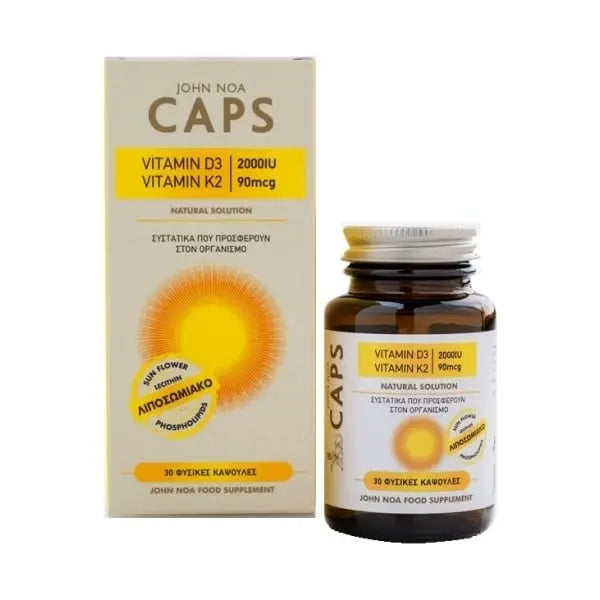 Το προϊόν John Noa Vitamin D3 2000IU & Vitamin K2 90mcg 30caps συνδυάζει δύο σημαντικές βιταμίνες για την υποστήριξη της υγείας των οστών και του ανοσοποιητικού συστήματος. Η βιταμίνη D3 (2000 IU) ενισχύει την απορρόφηση του ασβεστίου και τη λειτουργία του ανοσοποιητικού, ενώ η βιταμίνη K2 (90 mcg) βοηθά στη σωστή κατεύθυνση του ασβεστίου προς τα οστά, μειώνοντας την αποθήκευση του στα αγγεία. Το προϊόν είναι ιδανικό για την ενίσχυση της υγείας των οστών, της καρδιάς και του γενικού ευ ζην.